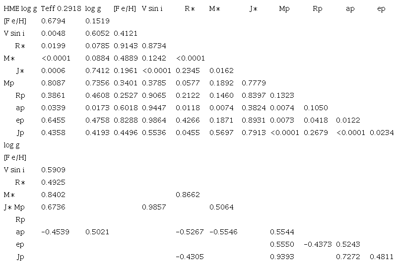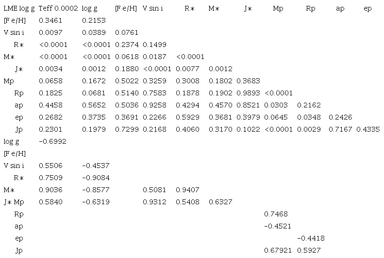 In the case of the planets, the most important result of this analysis is the (almost complete) absence of correlations between the parameters of the planets and the parameters of the stars (most obvious in the LMEs). The only parameter that shows some correlation with the star parameters is the semi-axis, ap , of the orbit of the planets in the HMEs. This might suggests a difference in terms of circularization. Two results also seem important. The first is that Rp is only correlated to Mp in in the HMEs, which is consistent with the fact that the radius of the HMEs is constant. The second is that there is no correlation between Jp and J∗, which is consistent with the behavior observed in Figure 5, and which could suggest that there is no dynamical coupling between the two. This, probably, is due to important losses of angular momentum during the formation of the stars and to migrations of the planets.