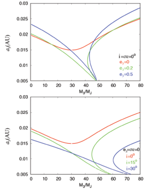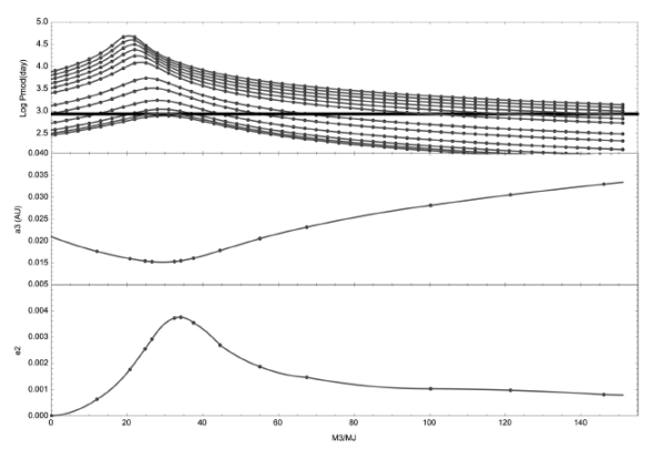 All curves in the upper panel of Figure 3 reach a maximum value for smaller values of the mass compared to Figure 8 (upper panel) of CH2012, for the same initial conditions. Therefore, in the middle panel of Figure 3, we also obtain smaller values for the masses of the possible third body compared to the middle panel of Figure 8 of CH2012 for the same initial conditions. Then, the minimum of this curve in this research is obtained when M3 = 29MJ and P3/P2 = 12.7, while the minimum in CH2012 was obtained when M3 = 48MJ and P3/P2 =13.4.