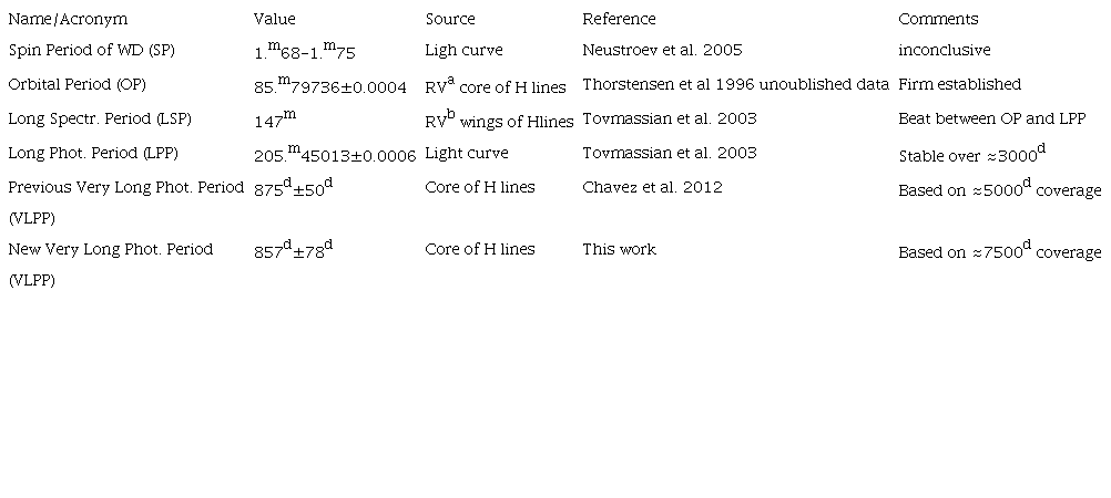 In Chavez et al. 2012 we ruled out that the VLPP could correspond directly to the period of a third body, since the object would be too far to have an important effect on the inner binary. We performed a series of numerical integrations and proved that indeed the effect is very small and could not explain the VLPP of the CV. Instead, we concluded that a third light-weight body could produce a disturbance on the central binary and that such perturbation may have a much longer period compared to the orbital period of the perturber (e.g. Mazeh & Shaham 1979, Soderhjelm 1982, Soderhjelm 1984, Georgakarakos 2002, Georgakarakos 2009). The third companion induced a long-term (secular) eccentricity modulation, as shown for example in Soderhjelm (1984).