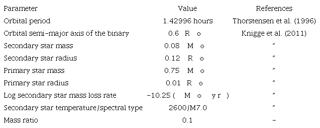 We decided to revisit these parameters, starting with the mass and radius of the secondary. Here we use the values that appear in Knigge et al. (2011), where they use the eclipsing CVs and theoretical constrains to obtain a semi-empirical donor sequence for CVs with orbital periods Porb ≤ 6h. They give all key physical and photometric parameters of CV secondaries, as well as their spectral types, as a function of Porb.