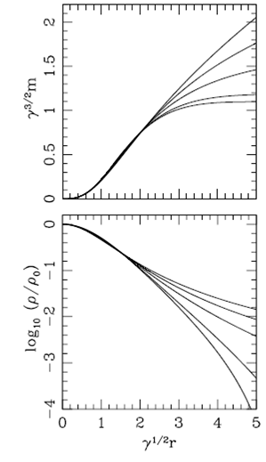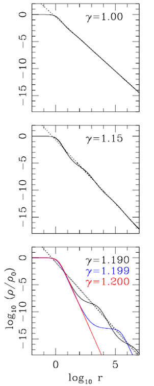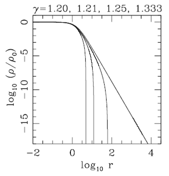 Figure 2 shows logarithmic depictions of the solutions obtained for γ values in the range. For all of the γ > 1.2 solutions we obtain densities that go to zero at a finite dimensionless radius (which can be straightforwardly determined from the numerical integrations).