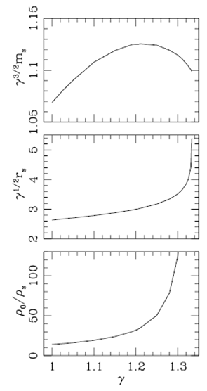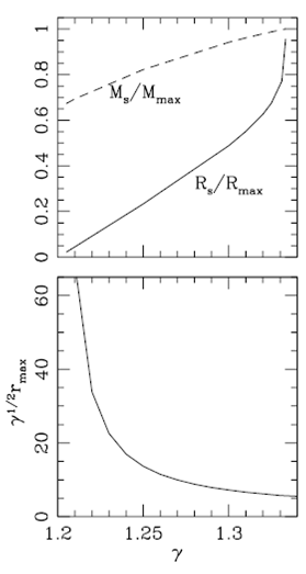 In Figure 4, we show the dimensionless mass (see equations [Mr]-[mr]), outer radius , and center to edge density ratio p0/ps of the maximal stable solution as a function of γ. We see that: