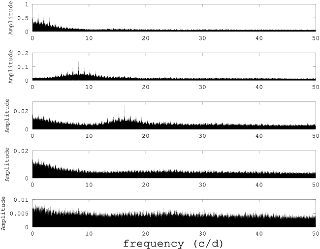 As a first method to determine the period, we used a time series method which is commonly utilized in the δ Scuti star community: Period04 (Lenz & Breger, 2005). There are several data sets which can be analyzed with this code: