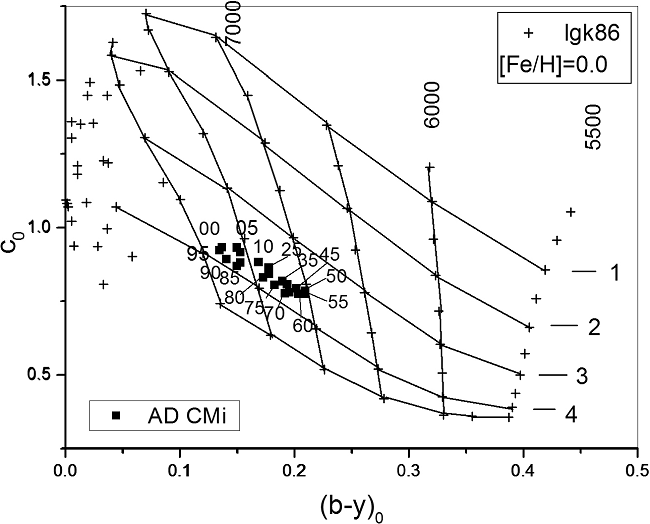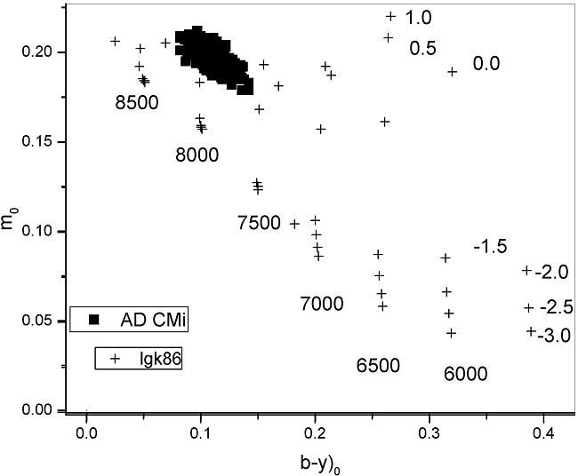 They derived an E(b-y) of 0.017 ± 0.007 and Te (K) of 7550 ± 190 and logg (dex) of 3.83 ± 0.06. The values we obtained are presented below and the results are equal, since the same uvby − β photometry was considered and the same analysis was done, though thirty years later with an extended time basis. A comparison between the photometric, the unreddened indexes c0 and (b−y)0 obtained for the star with the models allowed us to determine the effective temperature Te and the surface gravity logg (Figure 10). Table 9 lists these values. Column 1 shows the phase, Columns 2 the reddening; Columns 3 to 5 the unreddened indexes and β. Figure 10 shows the position of the unreddened color indexes of AD CMi in the theoretical models of LGK86. Phase is indicated as integers. Subsequent columns present the unreddened magnitude, the absolute magnitude, the distance modulus, the distance in parsecs and the effective temperature from the LGK86 plot. Column 12 lists the effective temperature obtained from the theoretical relation reported by Rodriguez (1989) based on a relation from Petersen & Jorgensen (1972, hereinafter P&J72) Te = 6850+1250×(β−2.684)/0.144 for each value and averaged in the corresponding phase bin. In the final column the surface gravity logg from the plot is presented.