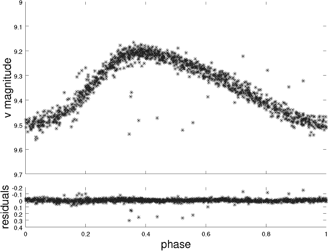 The results of utilizing Period04 gave as the first frequency 8.13830066c/d with an amplitude of 0.1409 and a phase of 0.1759. Evaluating the residuals we obtained the following numerical values: 16.254, 0.02898 and 0.4234 respectively. Fitting the data to these values gave as residuals a frequency of 0.0025c/d with an amplitude of 0.2881 and a phase of 0.1689. These values correspond to a period of 0.12287577d for the first frequency and to 0.061523d. Given the numerical frequency values the results of Period04 gave f and 2f, or a value close to it (16.276c/d). When a phasevs.magnitude plot was constructed, the phasing shows the correctness of the determined period (Figure 2).