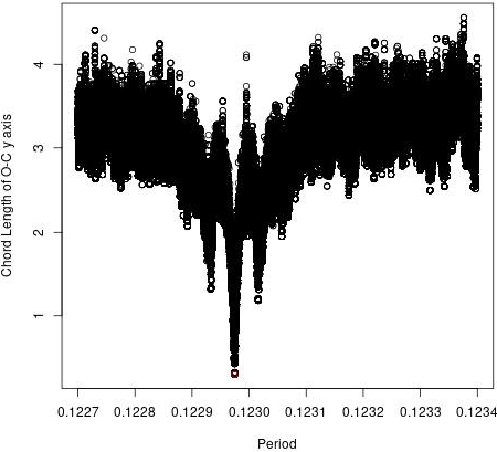 We employed another method based on the concept of the minimization of the chord length linking all the points in the O−C diagram for different values of changing periods, looking for the best period which corresponds to the minimum chord length (see the case of KZ Hya, Peña et al. 2018).