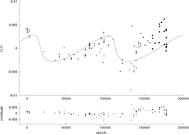and the continuous line in Figure 6 shows the sinusoidal fit over the O−C diagram with a new period.