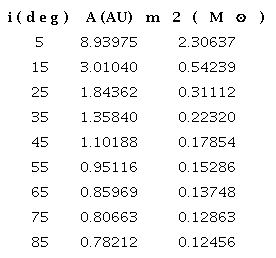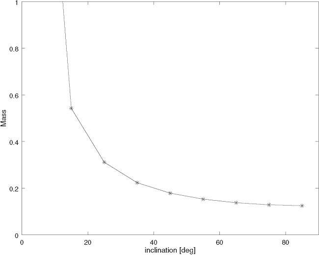 for a mass of obtained by McNamara (1997). A mass was calculated for several inclination angles as shown in Table 7, where the minimum mass that can be obtained for the companion star is 0. (Figure 7).
