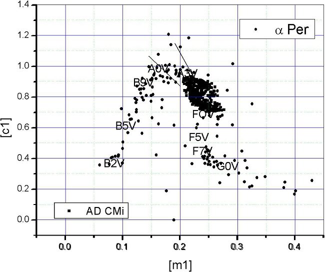According to Houk and Swift (1999) as reported in Simbad, AD CMi has a spectral type of F0IV/V. To corroborate this, we fixed its position in the unreddened color diagram [m1] vs. [c1] that was established for the open cluster Alpha Per (Peña et al. 2006) for which the unreddened color indexes were compared to the spectroscopically determined spectral types from several sources. In all cases the photometrically determined spectral types coincided with those determined spectroscopically, assuring us of the goodness of the method. We applied these calibrations to the uvby − β photometry obtained (Table 8) for AD CMi corroborating first that the known spectral type of AD CMi was correct (Figure 8). To further check our results using uvby − β photometry, we calculated the unreddened indexes [m1] [c1] from the other two sources, that of Epstein et al. (1973) and of Rodriguez et al. (1988). This latter reference reported the photometry of AD CMi differentially with respect to the star HD 63776 which was measured during two different years 2017 (once) and 2018 (three points) and obtained the following values for V , (b − y)1, m1, and c1 (8.181 ± 0.010, 0.335 ± 0.003, 0.155 ± 0.005, 0.347 ± 0.006) respectively which immediately allowed us to calculate the uvby − β values for AD CMi in the 1988 season. In all three cases with uvby − β photometry, the location of AD CMi is in the same position, making its spectral type determination unquestionable. In view of this, the prescription to determine the reddening is that of Nissen (1988).