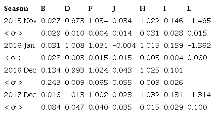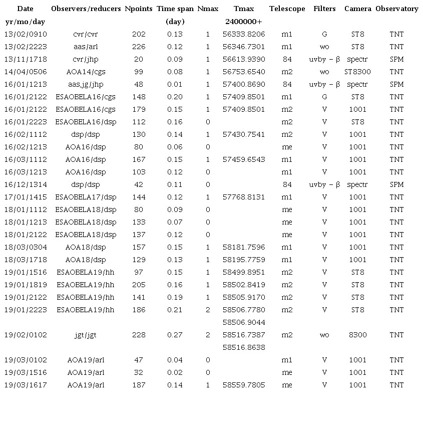 0.0065, 0.0085, 0.0212, 0.0179); (0.054, 0.012, 0.019, 0.025, 0.012) and (0.032, 0.010,0.011,0.013, 0.012) for the 2013 and both the 2016 and 2017 seasons, respectively, for a total of 94 points in uvby and 68 points in Hβ, which provide a numerical evaluation of our uncertainties. We must call attention to the bad quality of the December 2016 season. However, since the effects of the clouds compensate each other, the color indexes gave reasonable values, whereas the V showed significant larger scatter and, will not be taken into account. The obtained data will be sent to the archives and are available upon request.