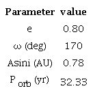 Pongsak Khokhuntod et al. (2007) stated that the binary orbit has a period of 27.2 ± 0.5 years, with an eccentricity of 0.8 ± 0.1. However, since there is a big gap between the first 12 data points and the rest, and the bulk of the data spans only one cycle, this result should not be considered to be an accurate solution of the orbital parameters.