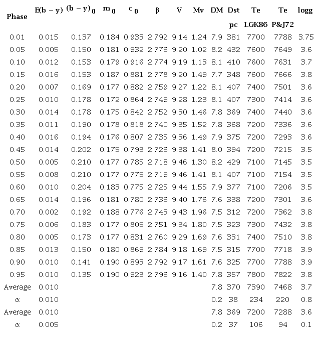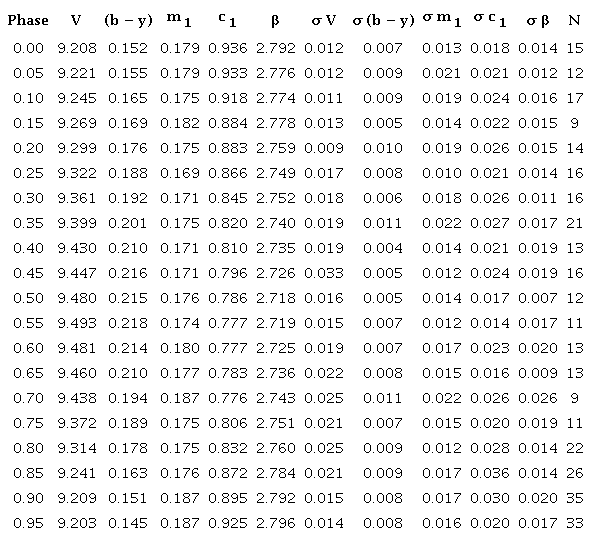 The averaged points are presented in Table (8), (Column 1 phase; Column 2 magnitude; subsequent columns list (b − y), m1, c1, next column presents values of Hβ). The standard deviation for each bin is presented in the subsequent columns. The last column presents the number of entries on average.
