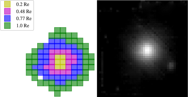 The left panel of Figure 1 shows the annular distribution of BCG 2039. The right panel is the fluxcollapsed VIMOS image. The annuli are 0.2, 0.48, 0.77 and 1.0 Re in each galaxy. The central aperture has been defined as 0.2 ± 0.03 Re . In Table 1, we show Re for each galaxy. BCG 1027 has z = 0.09 and Re = 6''.98; for this galaxy Re corresponds to ≈ 13kpc.