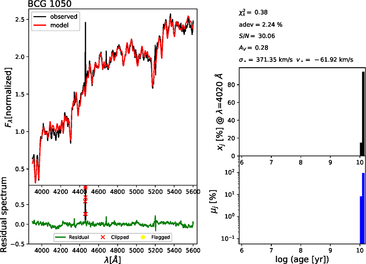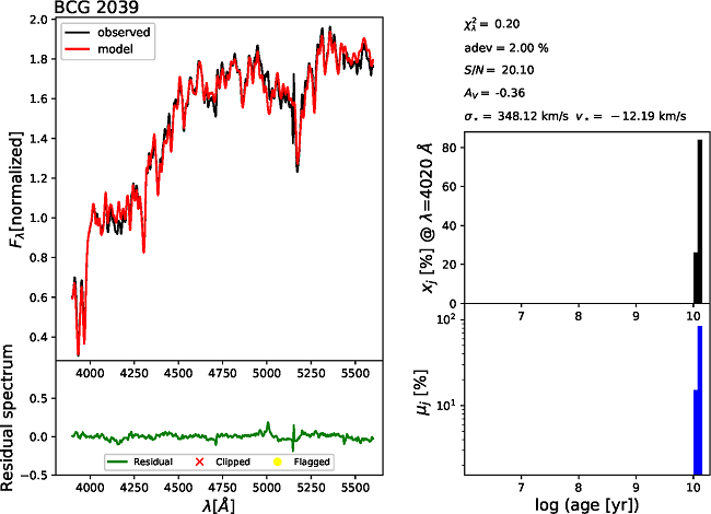 Figures 2 and 3 illustrate the spectrum fits obtained for BCGs. The upper left panel shows the observed spectrum (black line) and the model (red line). The lower left panel shows the residual spectrum (observed − model). The histograms in the right panel show the SFHs as % of the light fraction at 4020Å(upper) and as % of the mass fraction (lower) both decomposed into 15 ages and 3 metallicities. Some of the derived properties are shown in the upper right: χ2λ is the fit χ2 divided by the number of λ’s used in the fit; adev is the mean relative difference between the model and observed spectrum; S/N is the signal to noise ratio in the region centered at λ = 5000Å.