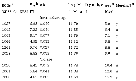 By using integral field unit (IFU) spectroscopy Oliva-Altamirano et al. (2015) performed an analysis of the stellar populations of 9 BCGs at z < 0.1. They showed that BCGs have high central metallicity, flat metallicity gradients and ages in a wide range of 5 to 15Gyr. They also found that 67% (6/9) of BCGs have intermediate central ages (5Gyr < age < 10Gyr) suggesting a history of active accretion (star formation up to z ≈ 1) and 33% (3/9) have old central ages (age > 11Gyr) reflecting that they have not had star formation since z ≈ 2. The stellar population measurements come from the luminosityweighed distribution and are sensitive to the brightest and youngest populations of the stars in the galaxy (e.g. Trager & Somerville 2009).