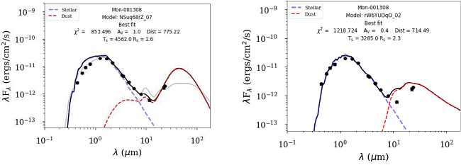 In order to pursue this further, we find a new synthetic SED using the Python-based fitting code Sedfitter (Robitaille 2017) based on the 3D dust continuum radiative transfer code Hyperion, an opensource parallelized three-dimensional dust continuum radiative transfer code by Robitaille (2011), which was used for the modeling in Sousa et al. (2019). This code is composed of modular sets with components that can include a stellar photosphere, a disk, an envelope, and ambipolar cavities. For Mon-1308, we used two sets of models. Model 1 is composed of a stellar photosphere and a passive disk, Model 2 includes a stellar photosphere, a passive disk, and a possible inner hole. The Hyperion SED model includes only a passive disk, and does not consider disk heating due to accretion. The input parameters of the Hyperion Sedfitter are a range of Av, the distance from the Sun, the fluxes, and the uncertainties. The input fluxes use UBV RcIc optical photometry from Rebull et al. (2002), near-IR photometry JHKs from 2MASS, IRAC (Fazio et al. 2004) and MIPS (Rieke et al. 2004) magnitudes from Spitzer satellite, and WISE observations at 3.4, 4.6, 12.0, and 22µm (Wright et al. 2010). We used the distance estimated from parallax data obtained from the Gaia second release (Gaia Collaboration et al. 2016, 2018).