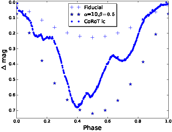 For both ∆magobs and ∆magIR,obs the range is [0.2,0.4]. A fit for ∆magobs is found when α = 5 (with 0.8 < β < 1), α = 7 (with 0 < β < 1) and α = 10 (with 0 < β < 0.8). Due to the grid of models, we run models for α = 5,7 and 10 but not for intermediate values; however other models with values of α between 5 and 10 are also inside the range for ∆magobs. For these models ∆magIR< 10−4 which is 3 orders of magnitude lower than required for a reasonable fit. The parameters for the models with β = 1 are shown in Table 4.
