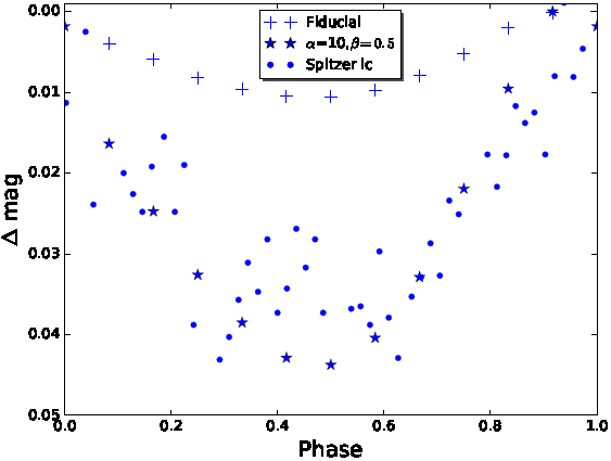 The observational values that we aim to model are the amplitudes for the optical (∆magobs ) and the IR lcs (∆magIR,obs ). These values are given in data of the CoRoT and Spitzer telescopes extracted by McGinnis et al. (2015) and included in Table 3. ∆magobs from the CoRoT Telescope and ∆magIR,obs are taken from the Spitzer telescope. The Spitzer photometric data include values for wavelengths of 3.6 and 4.5µm. Because the behavior is similar in both wavelengths we choose 3.6µm for the analysis.