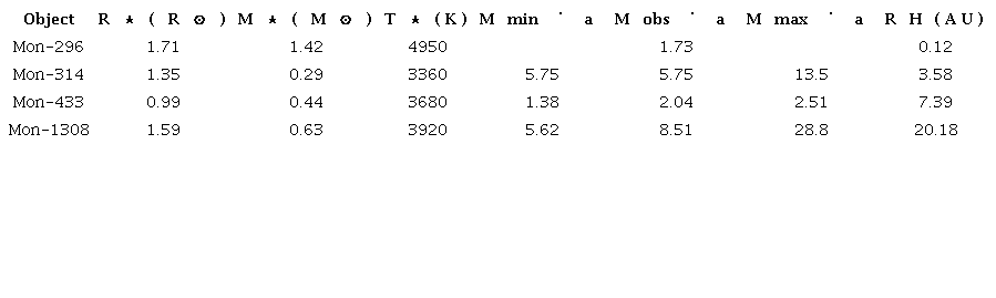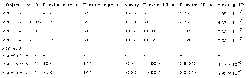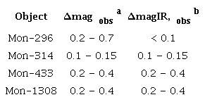 1.- For Mon-314 and Mon-1308, ∆mag ≈ ∆magIR but the model predicts ∆mag >> ∆magIR. Thus, we are able to model ∆magobs but not to consistently model ∆magIR,obs . Using the grid of models defined within the range 0.1 < α < 10 and 0 < β < 1, we cannot find a consistent model for Mon-433. Mon-296 is the only system where ∆mag >> ∆magIR; hence this is the only object that can be modeled using the optically thin material inside the disk.
