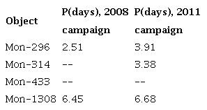 Another aspect to be pointed out is the resemblance or not of the CoRoT and Spitzer lcs: for Mon296 both lcs are completely different, for Mon-314 and Mon-433 there is a resemblance between both lcs and, finally, for Mon-1308, the resemblance is remarkable. A high resemblance between the lcs suggests a strong connection between the mechanisms explaining them.