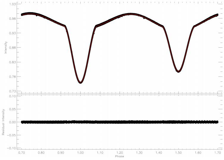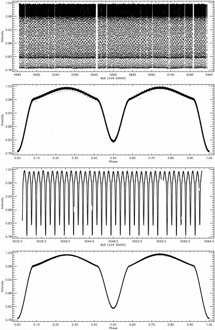 In the light curve and O−C analyses, we mainly use long cadence (29.4 minutes of exposure time, hereafter LC) Kepler photometry, which is available in the Kepler eclipsing binary catalogue3 as detrended and normalized fluxes (Slawson et al. 2011; Prša et al. 2011). We also use the short cadence (hereafter SC) data from the same database in the same format, in order to investigate possible high frequency variations. The data were collected over a broad wavelength interval between 4100Å and 9100Å, which suffers from lack of color information, but provides very high precision. The LC data cover ≈ 4 years of time base without any considerable time gap. The reported light contamination is 0.3% in the MAST database, practically meaning no light contribution of any light sources from the background. Available SC and LC photometry is shown in Figure 1. In the figure, we computed the phase-folded light curve with respect to the light elements in equation (1) given by Slawson et al. (2011).