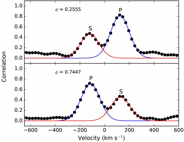 We start our analysis with the measurement of the radial velocities of each component, in order to determine the spectroscopic orbit of the system. For this purpose, we cross-correlate each observed spectrum of KIC 8043961 with spectra of ι Psc and o Aql. The cross correlation was applied according to the method proposed by Tonry and Davis (1979). The practical application of the method was done with the FXCOR task under IRAF environment. Among the two template stars, ι Psc provided a slightly better cross-correlation and was adopted as the radial velocity template. Cross-correlation was performed for the wavelength range between 4900 - 5400Å, ignoring strongly blended spectral lines. In Figure 2, we show the cross-correlation functions of spectra obtained at orbital quadratures, where both components are clearly resolved.