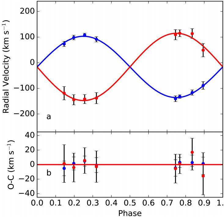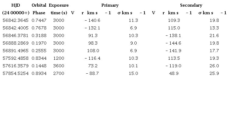 We tabulate the measured radial velocities in Table 2, together with brief observational information. In the table, orbital phases are calculated via ephemeris time and period given by Borkovits et al. (2016). These light elements are adopted for phasing the radial velocities and light curve.