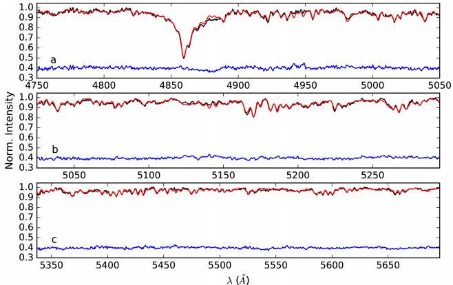 In order to estimate atmospheric properties of the components reliably, we use the TFOSC spectrum of KIC 8043961 obtained at HJD 2456842.3645, corresponding to ≈ 0.75 orbital phase, where we can clearly resolve spectral lines of both components. The SNR of that spectrum is around 170, based on photon statistics. Before searching for the best atmospheric parameters, we fixed the micro-turbulence velocity of each component at 2 kms−1, and the logarithm of the surface gravity log(g) of the primary and secondary components at 4.04 and 3.77, respectively. These log(g) values are calculated from combination of spectroscopic orbit parameters and light curve modeling results (see next section). Then we adjusted effective temperatures and metallicities of the components via the spectral synthesis method in a wavelength interval 4750 - 5750Å. In practice, we used the latest version of the Python framework iSpec (Blanco-Cuaresma et al. 2014). Synthetic spectra were calculated for temperatures between 6250 - 7250 K with steps of 50 K, and for metallicities between solar (0.0) and −1.0 with steps of 0.25. Among the different radiative transfer code options provided by iSpec, we adopted SPECTRUM4 code (Gray and Corbally 1994) along with ATLAS9 model atmospheres (Castelli and Kurucz 2004) and a line list obtained from the third version of the Vienna atomic line database (VALD3) (Ryabchikova et al. 2015).