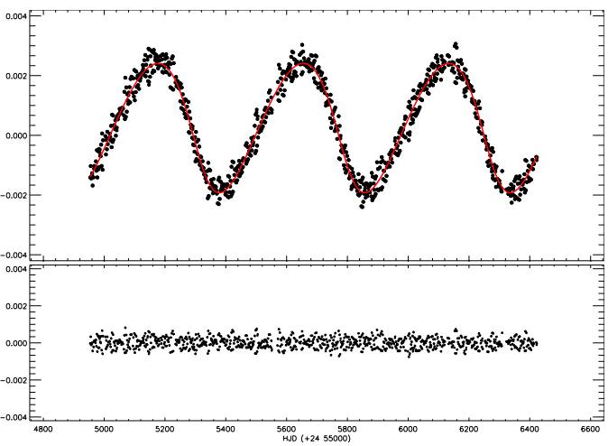 Inspecting the O − C values, we notice a clear sinusoidal variation, which is presumably due to the light travel time effect (hereafter LTTE) caused by an unseen third body in the system. Taking the light elements given in equation (1) as initial values, we modelled the sinusoidal variation together with the linear trend. Corrected ephemeris time and period are given by equation (2):