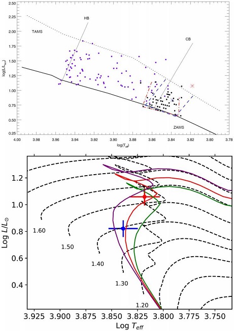 The combination of results obtained from both the spectroscopic orbit and light curve modelling yields the physical parameters of the system listed in Table 7. These parameters show that the smaller, hotter and less massive primary component is still on the main sequence, while the larger, cooler and more massive secondary component appears to have evolved off the main sequence. We show the position of the components on the log - plane in Figure 7. In the bottom panel of the figure, the evolutionary status of the components is shown in the same plane with isochrones for [M/H] = −0.25 (Bressan et al. 2012). The average age of the system is about 2.2 ± 0.3 Gyr.