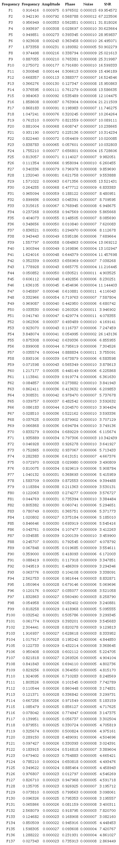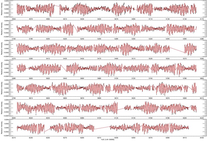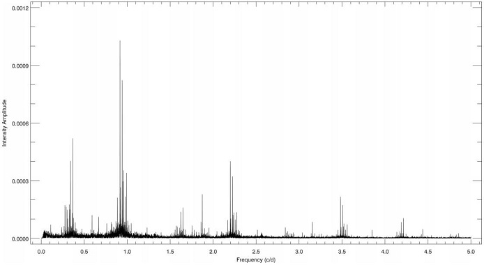 Inspecting the residuals from the light curve modeling, we find a clear signal of a sinusoidal variation at out-of-eclipses. Considering the place of the primary component of KIC 8043961 in the HR diagram, the source of the variation is possibly a γ Doradus type pulsation. We analyse the residual data to search for possible pulsation frequencies, using the PERIOD04 software (Lenz and Breger 2005) that is based on the discrete Fourier transform (hereafter DFT) method (Scargle 1982). As seen in Figure 8, we found 137 frequencies which exceed the 3 σ level. We tabulate these frequencies in Table 8, and plot the resulting model obtained from these frequencies together with the residual light curve in Figure 9.