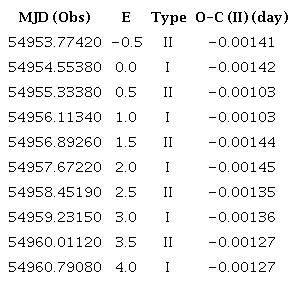 then run the differential correction program of the Wilson-Devinney code by only adjusting ephemeris time and keeping all other parameters fixed. This process is fairly straightforward for primary eclipses, while we need to change the role of the components during the iterations, in order to compute secondary eclipses. Ten computed minima times are listed in Table 4, while the rest of them are available upon request. For each observed eclipse time, we compute expected eclipse times by using the following light elements (equation 1) to obtain O − C values:
