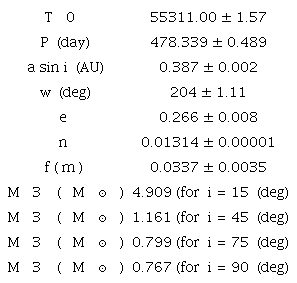 Assuming that the orbital inclination of the presumed third body is the same as the inclination of the eclipsing binary, and using the calculated total mass of the eclipsing binary (2.892 ) for the absolute parameters of the components, we estimated the mass of the third body as listed in Table 5 for different i values.