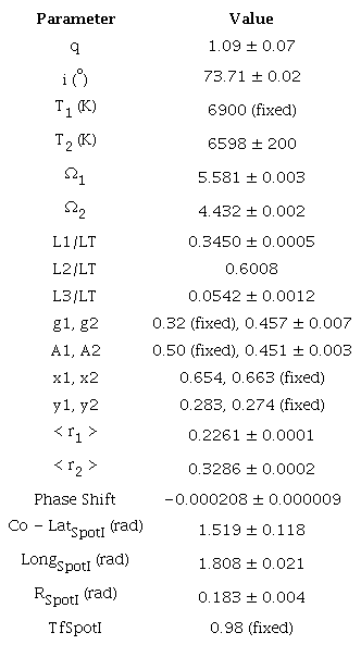 To determine the physical conditions of the components, we model the average SC light curve by using 2015 version of the Wilson - Devinney Code (Wilson and Devinney 1971; Wilson and Van Hamme 2014). The shape of the light curve clearly indicates a detached configuration. In the analysis, we fix the two critical parameters, mass ratio and effective temperature of the primary component (T1) to 1.09 and 6900 K, respectively, which are found from the spectroscopic orbit modelling and the spectral type estimation. Considering the spectral type corresponding to this temperature, the albedos (A1 and A2) and the gravity-darkening coefficients (g1 and g2) of the components are adopted for the stars with convective envelopes (Lucy 1967; Rucinski 1969). The nonlinear limb-darkening coefficients (x1 and x2) of the components are taken from Van Hamme (1993). In the analyses, the temperature of the secondary component (T2), the dimensionless potentials of the components (Ω1 and Ω2), the fractional luminosity of the primary component (L1), the inclination of the system (i), the mass ratio of the system (q), the semi-major axis (a) and the third light are adopted as adjustable parameters. Although the synthetic curve derived by these parameters covers the entire observed light curve, a stable sinusoidal variation is still seen at out-of-eclipses. Considering the temperatures of the components, we modelled this variation by a stellar cool spot on the secondary component. We list the best-fitting model results in Table 6, and show the averaged phase-folded light curve together with the model in Figure 6.