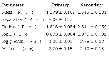 RESUMEN: Presentamos nuevos hallazgos sobre KIC 8043961. Encontramos que la temperatura efectiva es de 6900 ± 200 K para la primaria, y de 6598 ± 200 K para la secundaria, mientras que los logaritmos de las gravedades superficiales son, respectivamente, 4.06 cm s−2 y 3.77 cm s−2. Combinamos la curva de luz con un modelado espectroscópico de la órbita y obtenemos un cociente de masas 1.09\pm 0.07, una inclinación orbital de 73.71 ± 0.14 y un semieje mayor de . Calculamos las masas de la primaria y de la secundaria, y obtenemos y Los radios son, respectivamente, y . Además encontramos una contribución apreciable de un tercer cuerpo, (). Calculamos la masa posible del tercer cuerpo y obtenemos . Encontramos que la primaria muestra pulsaciones tipo γ Dor con 137 frecuencias.