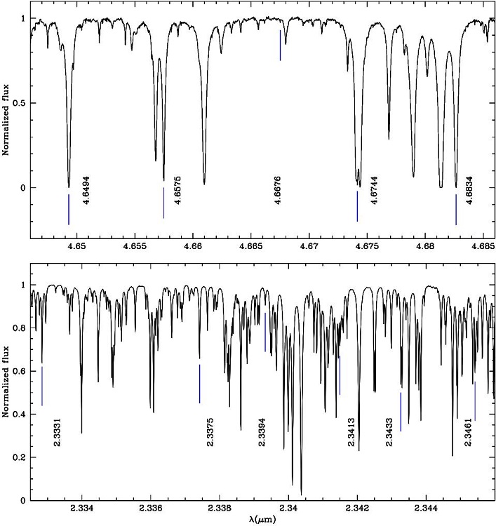 Figure 2 illustrates the KS − and M− bands IR telluric spectra, where CO absorption lines are clearly identified with our computed lines. In these regions the absorption features present in the atmosphere are caused by water vapour, carbon dioxide and greenhouse gases.
