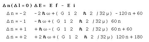 Tables 1 and 2 give the vibrational and rotational transitions for an initial state | n,li. The energy transitions displayed above only show a change of state in a single Hamiltonian (vibrational or rotational). All the other transitions are described by the combination of transitions between both quantum numbers given by the selection rules ∆n = ±1,±2 and ∆l = ±1,±2.
