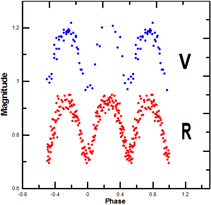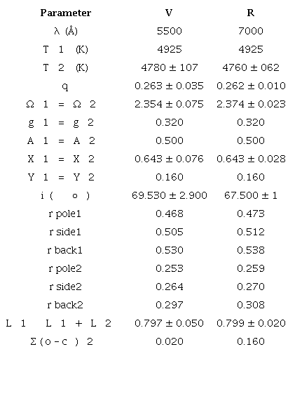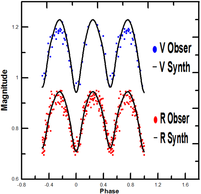 The light curve analysis of the system [NBN2015]78 is performed using the light curves in both V and R bands and is carried out using the program of Wilson-Devinney (W-D, Nelson 2009; Wilson and Devinney 1971). We assumed gravity darkening and bolometric albedo exponents appropriate for the convective envelopes of late-type stars (Teff < 7500K). We adopted g1 = g2 = 0.32 (Lucy 1967) and A1 = A2 = 0.5 (Rucinski 1969). The limb-darkening coefficients were interpolated from the tables of van Hamme (1993) using the logarithmic law and the values X1 = X2 and Y1 = Y2 for the over-contact mode. The effective temperature of the primary star (T1) is adopted as 4925 K (Flower 1996), corresponding to a B−V color index of 0.959 from the combined light of both components (Nardiello et al. 2015). The adjusted parameters are the orbital inclination (i), the mean temperature of the secondary star (T2), the potential of the two components Ω = Ω1 = Ω2, the mass ratio (q), and the luminosity of the primary star (L1). We used Mode 3 in the Wilson-Devinney (W-D) program (over-contact mode not in thermal contact). The orbital solutions using both V and R light curves are performed and the accepted parameters are listed in Table 7. Figure 10 shows the best match between the model and the observed light curves. The solution shows that the primary component is the more massive and the hotter one, with a difference in effective temperature equal to 145 K. According to this solution, the two components of [NBN2015]78 are of spectral types K1 and K2 (Covey 2007).