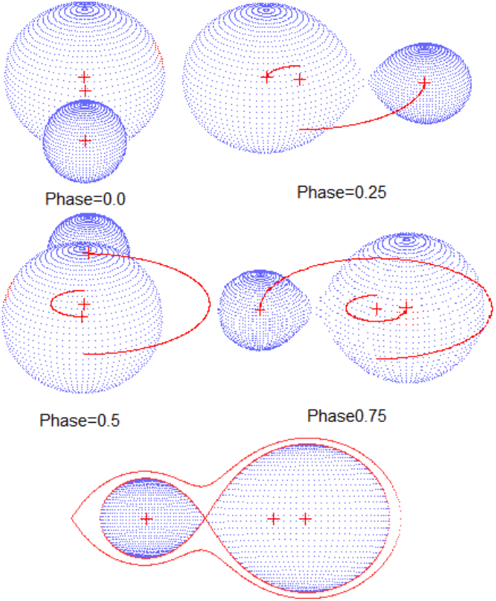 Figure 11 shows the geometric configuration of [NBN2015]78 at different phases and the corresponding Roche lobe geometry. The absolute physical parameters of the system are calculated using the empirical relations of Harmanec (1988). The mass of the primary component , while the mass of the secondary component is directly calculated from the estimated mass ratio of the system as . The radii of the two components ; and the bolometric magnitudes and also calculated and listed in Table 8.