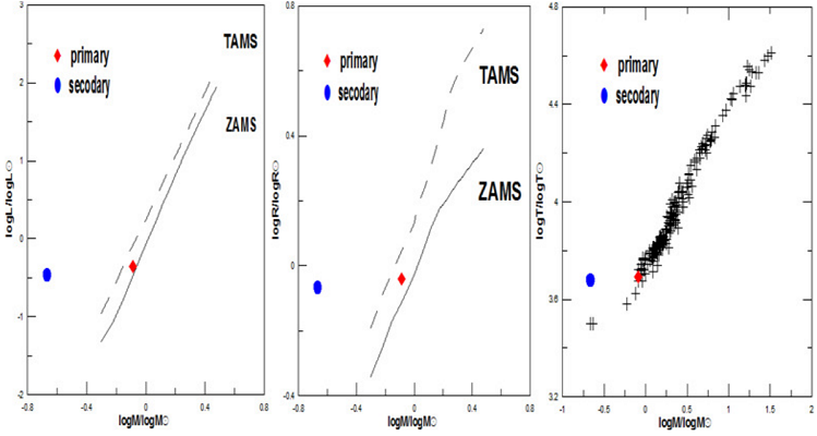 The right panel also shows the location of the components on the empirical M − Teff relation for intermediate mass stars from Malkov (2007). As it is clear from Figure 12 (left and middle panels) the primary component is lying on the ZAMS track while the secondary component is an evolved star.