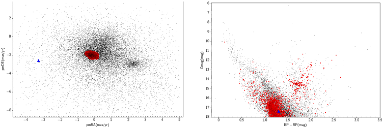 To obtain the best astrometric precision of the proper motions, we used the sources brighter than G = 18 mag, which correspond to typical astrometric uncertainties smaller than 0.3 mas/yr in proper motion (Cantat-Gaudin et al. 2018, Lindegren et al. 2018). Using the Vector Point Diagram (VPD) of the proper motions in RA and DEC, we select the overdensity in the cluster region, obtaining 2103 stars (red region on the left panel, Figure 2). To obtain the candidate cluster members, we removed stars from the selected cluster region (red region) if their proper motions in RA and DEC were inconsistent with a median proper motion by more than three median absolute deviations (MAD). The color magnitude diagram (CMD) in the right panel of Figure 2 shows that the candidate members (red dots) fall on a well-defined main sequence. The selected cluster region of the candidate members has a nearly ellipsoidal shape. The equivalent radius (with a and b the semi-major and semi-minor axes of the ellipse, respectively) of the selected cluster region is 0.7 mas/yr. This value is well within the range of the best-precision Gaia proper motions of 2 mas/yr (Ferreira et al. 2019).