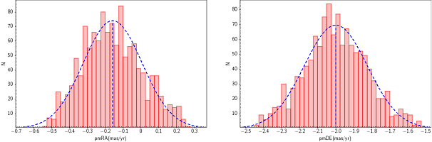 To determine the mean proper motion of the cluster, we constructed the histograms and made a Gaussian fitting of the proper motions in both directions RA and DEC, see Figure 3. We found that the mean proper motion of NGC 2158 is pmRA =−0.159 ± 0.165mas/yr and pmDEC = −2.000 ± 0.175mas/yr. These values are in good agreement with the values obtained by Cantat-Gaudin et al. (2018), see Table 1.