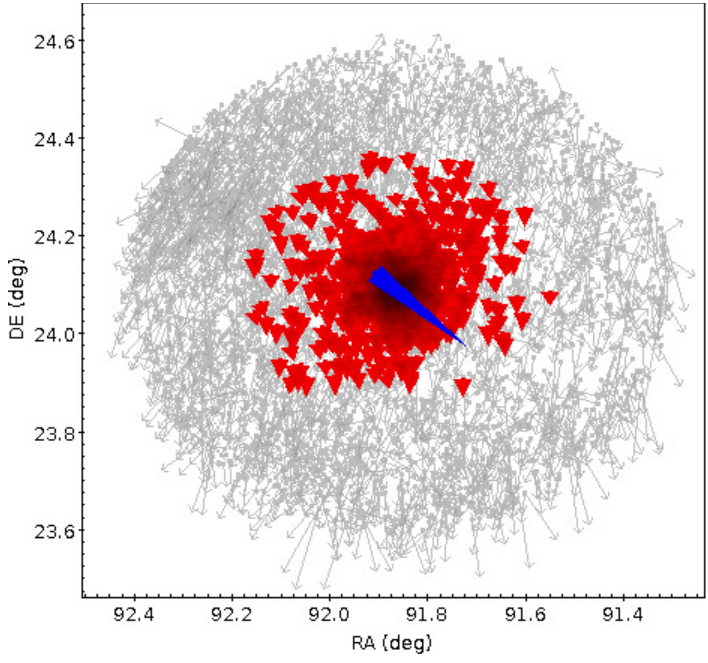 Stars are considered members if they lie inside the overdensity cluster region in VPD and have proper motions in RA and DEC within ±3 MAD from the mean proper motion; they must also have a clear main sequence in the CMD (Figure 2). These stars must be inside the limiting radius and they should have the same direction of proper motion vectors (Figure 4). The cluster members must have the same angular speed in the space.