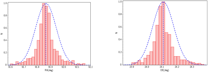 To determine the cluster center we count the stars in right ascension (RA) and declination (DEC). The center of the open cluster NGC 2158 is calculated at the point where the maximum stellar density of the cluster’s area is reached, using a Gaussian fitting. The center of the cluster NGC 2158 is found to be at RA = 91°.866±0°.077 and DEC = 24°.109±0°.070, and the corresponduing Galactic coordinates are and (Figure 5). We find that that the difference between our estimation of the centre of the cluster in RA and DEC and that of Cantat-Gaudin et al. (2018) is 14''4 and 0'.60, respectively. The difference with the values from Anderson et al. (2013); Wu et al. (2009); Dias et al. (2002) is 43''.2 and 0'.72, respectively (Table 2).