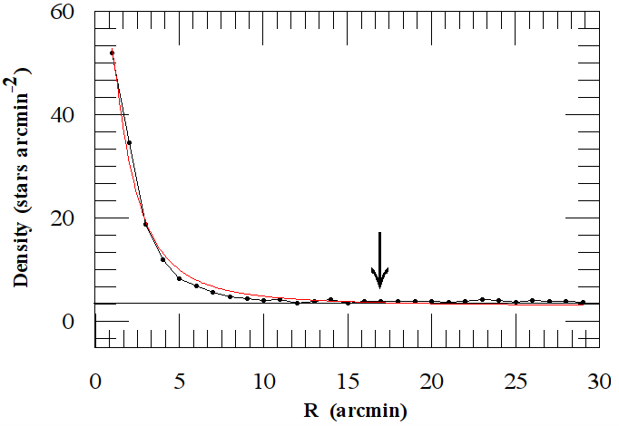 where fbg, f0 and Rcore are the background density, the central star density and the core radius of the cluster, respectively. The bestfit values are f0 = 67.06 ± 2.47 stars/arcmin2 and Rcore = 1'.70 ± 00.08 see Table 3. The limiting radius of NGC 2158 is estimated as Rlim = 17'.00, beyond which stars begin to merge with the background population (see Figure 6, Tadross and Hendy 2016; Hendy 2018). Following Peterson and King (1975), we find that the concentration parameter C = logs(Rlim/Rcor) of NGC 2158 is C = 1.00.