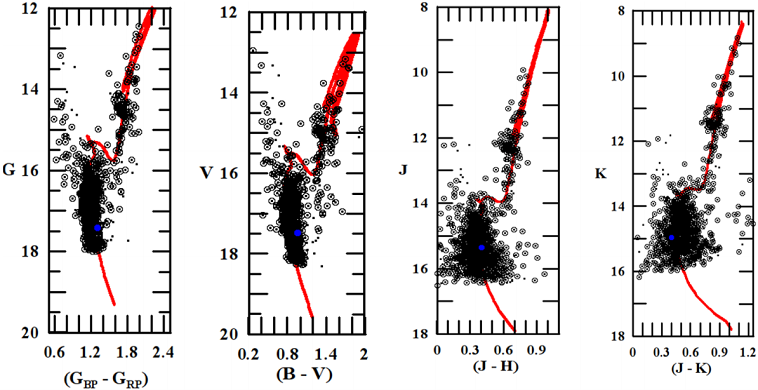 To obtain photometric data for multi-color magnitude diagrams (MCMDs), we cross-matched our cluster members in Figure 4 with Gaia, 2MASS and BV data from Nardiello et al. (2015). We obtained 1223 common stars which are members of the cluster. The MCMDs of NGC 2158 are built using optical data from Gaia DR2 [G,(GBP −GRP)], Nardiello et al. (2015) [V,(B − V )] and infrared 2MASS data [J,(J − H) and J−,J − K)] are shown in Figure 7.