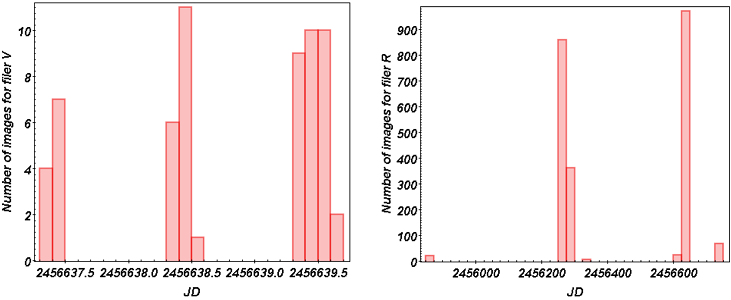 The photometric analysis of [NBN2015]78 was carried out using the data obtained by Nardiello et al. (2015), using the SBIG STL-11000M camera attached to the Asiago 67/92 cm Schmidt Telescope, available at the Astronomical Observatory of Padova (OAPD-Osservatorio Astronomico di Padova). The V , R data were collected from a number of images gathered over the three seasons. Table 5 presents the total number of observations in each filter as obtained from Nardiello et al. (2015) and Figure 8 shows the histogram of the observations in each filter.