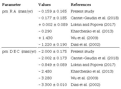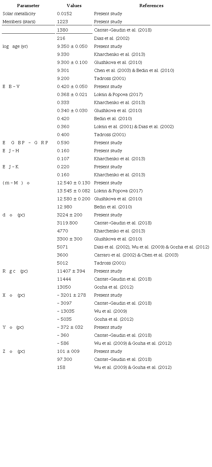 Cantat-Gaudin et al. (2018) calculated the distance of 1229 open clusters by using the UPMASK code of probable cluster members with probabilities larger than 50%. Lindegren et al. (2018) found that the Gaia DR2 parallaxes are affected by a zero-point offset of −0.029 mas. Cantat-Gaudin et al. (2018) reported in their Table 1 (Vizier database reference J/A+A/618/A93) the distance and its uncertainties d, d+ and d− as 4535.1, 3119.8 and 8301 pc respectively4. We estimate a distance of pc using the best fit of the isochrones in the multi-color magnitude diagrams of optical and 2MASS data (Figure 7), in a good agreement with the smaller value of d+ = 3119.8 pc of Cantat-Gaudin et al. (2018).