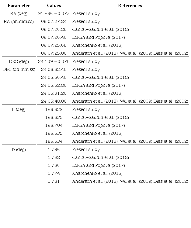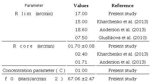 Our estimations of the core and limiting radii are in very good agreement with the ones obtained by Anderson et al. (2013) and Kharchenko et al. (2013), see Table 3, but the limiting radius obtained by Glushkova et al. (2010) is significantly smaller than the one we find.