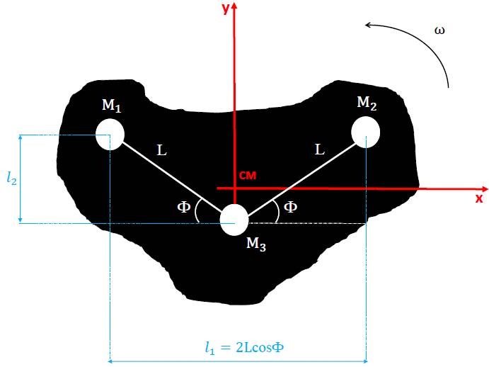 The origin of the reference system (xy) is at the center of mass of the asteroid. The angle formed by each rod with the x-axis is called the azimuthal angle and is denoted by Φ . We assume that both rods make the same angle with the horizontal axis. The geometric configuration of the asteroid depends on this angle. The more arched the shape of the asteroid, the larger is the azimuthal angle. Note that when Φ = 0◦ the length of the asteroid is maximum and equals to two canonical units. The equations that describe the motion of the particle in the xy plane around the tripole are written in a rotating frame that rotates with constant angular velocity ω = 1, in canonical units. The unit of time is defined such that the period of rotation of the tripole is equal to 2π. We consider that M1, M2, and M3 have equal masses, i.e., m1 = m2 = m3.